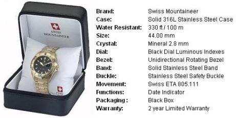 | | Fine Mens Bracelet Watch Gold Swiss MadeThis watch is Out Of Stock The Swiss Mountaineer 1272 is an excellent example of fine craftsmanship and quality that has made Swiss watches famous. It is made with durable and elegant gold plated stainless steel in not only the watch casing, but in the wrist band as well. This 44mm watch face is just the right size to be easily readable, yet is not so large as to be cumbersome on the arm of the wearer. Using precision Swiss ETA 805-111 movement ensures that this men’s wrist watch will accurately keep the time to keep you on schedule. Plus with the backing of a two-year warranty and an elegance that never goes out of style, this is one fine watch that will be on your arm for some time. ![]() Customers Also Purchased | WATCHES FOR SALE ![]() Riana RCW0007 Womens Heart Shaped Rose Gold Bling Watch Retail Price: $240.00 Our Price:$195.00![]() Kings and Queens KQ2650BRRG Gold Mechanical Skeleton Watch Retail Price: $125.00 Our Price:$39.90![]() Rugged Mountaineer Chronograph Swiss Watch Retail Price: $295.00 Our Price:$221.50![]() Ingersoll IN1607CR Bison No. 28 Mens Automatic Watch $460.00 ![]() Kings and Queens KQ4001 Oversized Mens Watch Retail Price: $325.00 Our Price:$195.00![]() Swiss Mens Interchangeable Watch & Compass Retail Price: $215.00 Our Price:$165.00![]() Swiss Womens Dual Time Crystal Watch Retail Price: $275.00 Our Price:$215.00![]() Yellow Swiss ChronoSport Watch Black Dial Retail Price: $275.00 Our Price:$185.00![]() Black Chronograph Watch Swiss Made Retail Price: $295.00 Our Price:$221.25![]() Swiss Mountaineer SM1450 Black Nylon Band Watch Retail Price: $195.00 Our Price:$125.00 |
