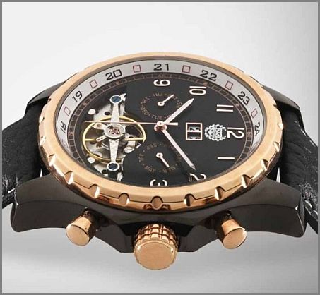 | | Luxury German Automatic WatchThe Luxury German Automatic Watch is a beautifully designed automatic watch that stands out in the crowd. It comes with a 35 jewel automatic watch movement. Its large luminous dial displays the date, day of the week and month. This is a luxury watch with handsome black leather strap. You’ll also love the many expertly crafted features of this mechanical watch. This luxury watch is characterized by its exclusive design and high quality materials. The German mark Kronwerk stands for innovation and reliability. This is German Watch Making at its best.